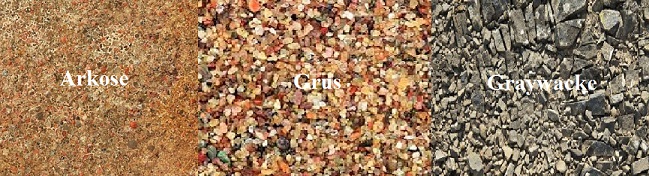 Greywacke is easily distinguished from Arkose. Greywacke contains quartz and feldspar, as does Arkose, but will be harder and darker in color. It contains poorly sorted angular grains of rock fragments set in a clay-fine matrix. It is a texturally immature sedimentary rock. The larger grains range in size from sand to gravel and the matrix materials generally constitute more than 15% of the rock by volume. According to the normal geologic laws of sedimentation, gravel, sand and mud should not be laid down in a mixture, but have layers of seperation. Geologists attribute this formational mixture to sub-marine avalanches or strong turbidity currents which cause mixed-sediment slurries to settle out of solution and create Greywacke.
