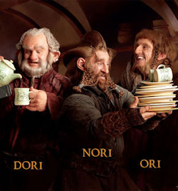 Dori was one of the twelve companions of Thorin and Bilbo on the Quest of Erebor. He was the brother of Nori and Ori. It fell to Dori to carry Bilbo in the tunnels of the Misty Mountains, but Dori dropped Bilbo and the other dwarves blamed him for "losing their burglar." Later, during the escape from the Wargs when they all climbed trees, Dori climbed back down to help Bilbo, who could not get up on his own. When the Eagles carried them off, Bilbo grabbed hold of Dori's legs as they went. In The Hobbit, Dori is described as "a decent fellow, despite his grumbling," while Thorin described him as being the strongest member of the company. He wears a purple hood.