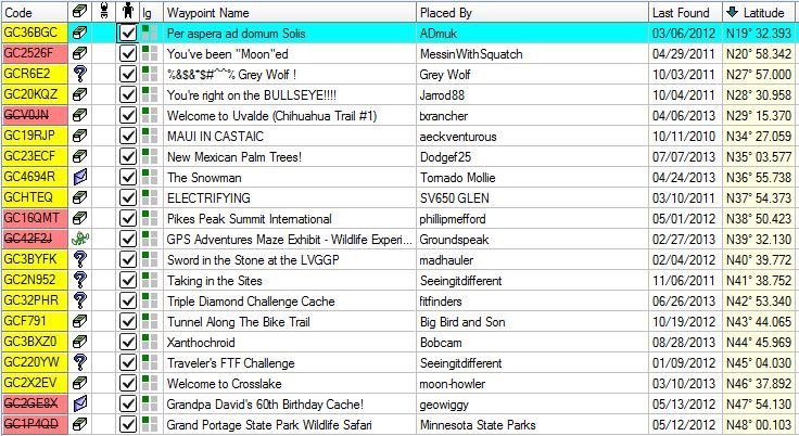 Certify your find by listing your twenty (20) qualifying degrees of latitude finds any way you wish as long as its clear you have twenty (20) different degrees of latitude covered. If you choose to make a bookmark list for this challenge, it would be helpful if you could list the degree of latitude in the comments section (but not required) and keep it active for three months after you log the find. Here's to show how I qualified myself:
