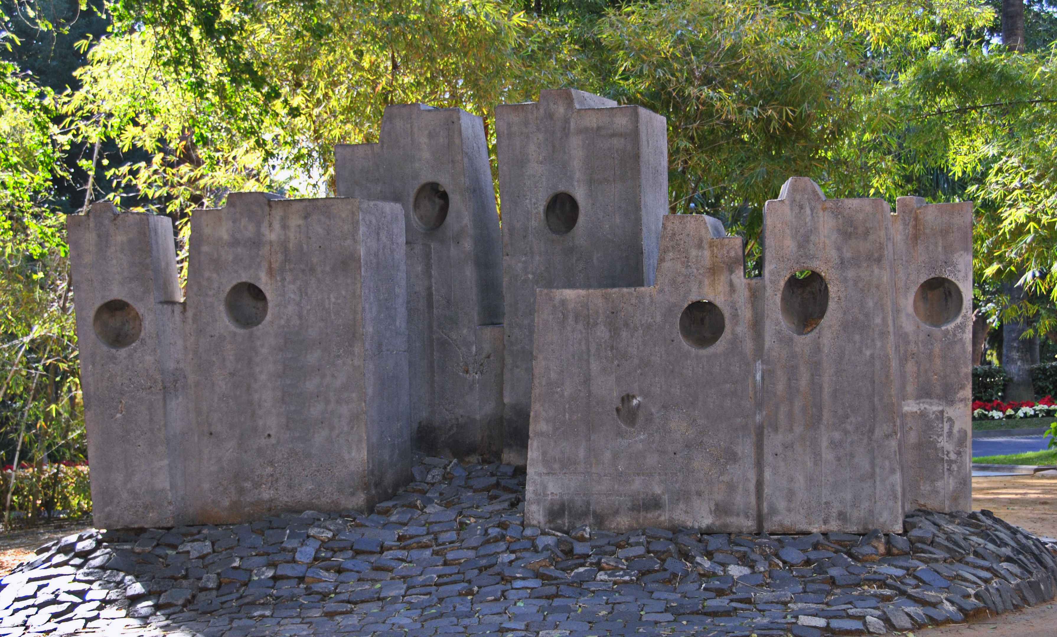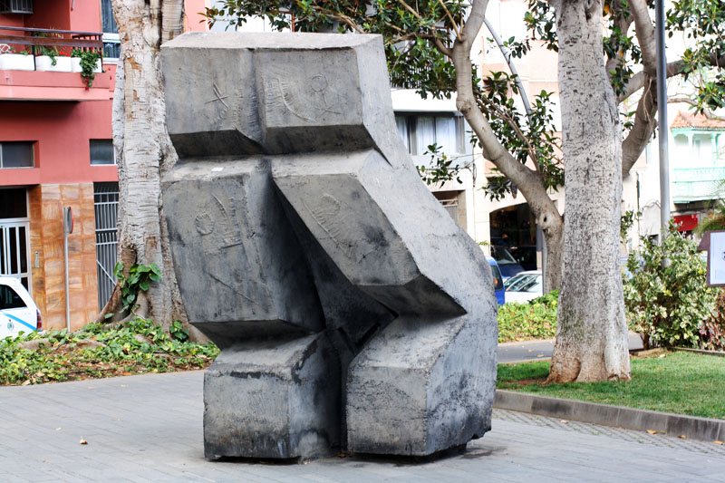 Homenaje a las islas Canarias, escultura, hormigón, grupo arquitectónico compuesto por siete volúmenes almenados emergiendo de un suelo adoquinado, a modo de erupción volcánica, los cuerpos tienen forma piramidal truncada asimétrica de base cuadrangular que se adosan a diferentes alturas, apreciándose en cada módulo perforaciones circulares, con una instalación eléctrica interior, 1973, autor Pablo Serrano (Crivillén, Teruel, 1910-Madrid, 1985).