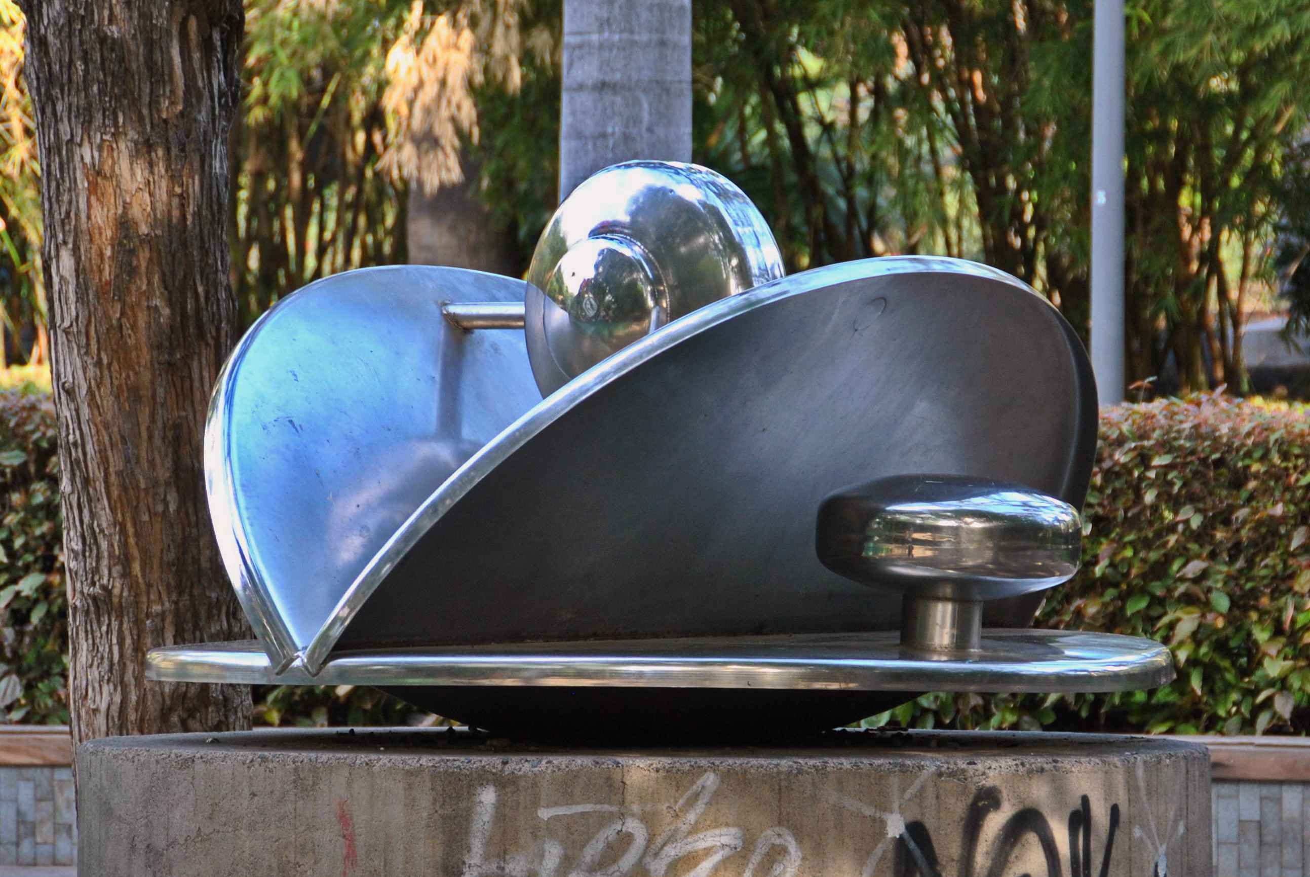 Homenaje a Millares,escultura, con carácter aerodinámico, se puede rotar, acero inoxidable, sobre una base cilíndrica de hormigón, contiene en su centro una concavidad, autor Claude Viseux (Champagne-sur-Oise, Francia, 1927).