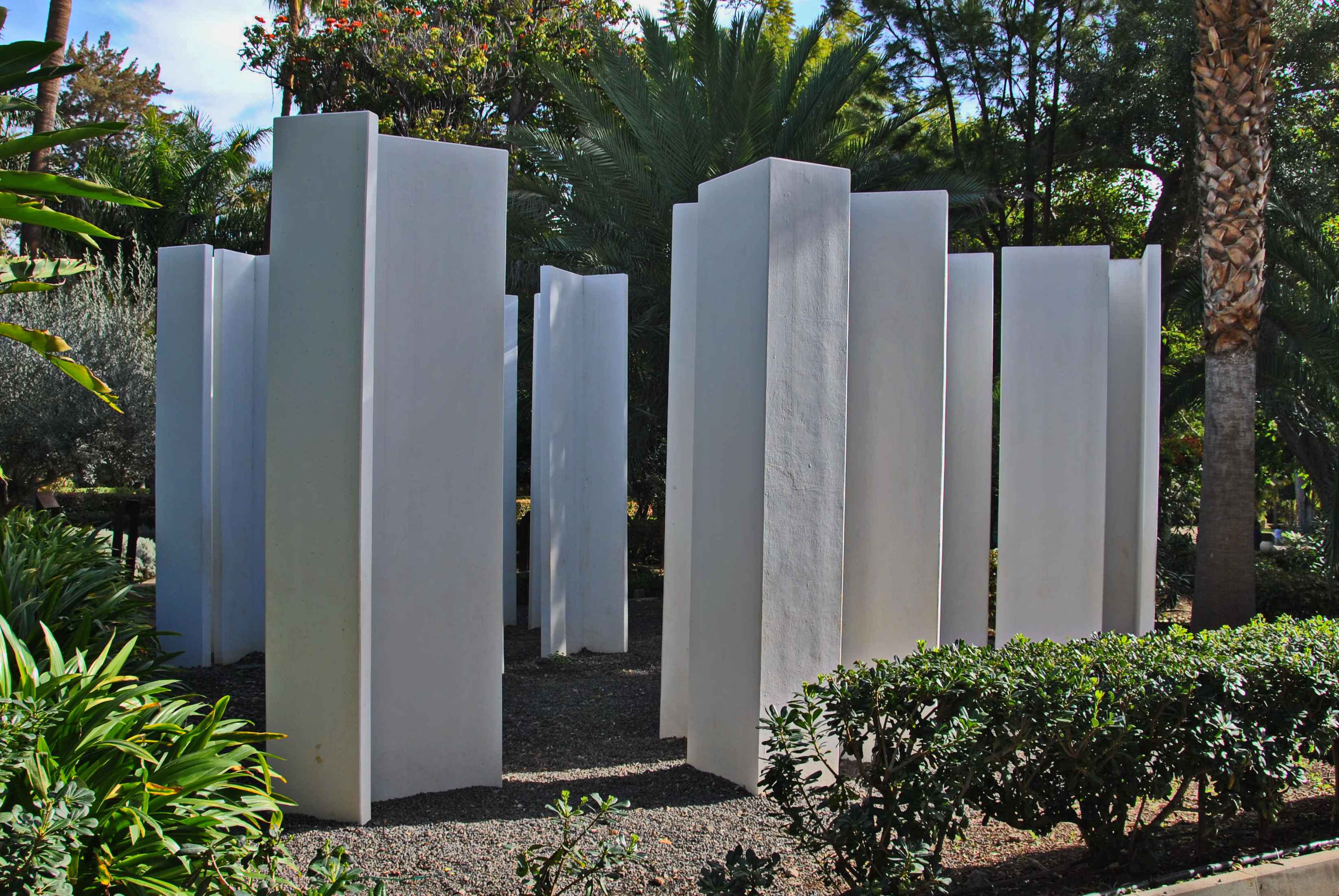 Laberinto: Homenaje a Borges, escultura, hormigón armado pintado de blanco, compuesta por veintidós módulos vertientes distribuidos en diferentes puntos de la base cuadrangular sobre la que se elevan, los módulos se presentan lisos y pintados de blanco, 1973, autor Gustavo Torner (Cuenca, 1925).
