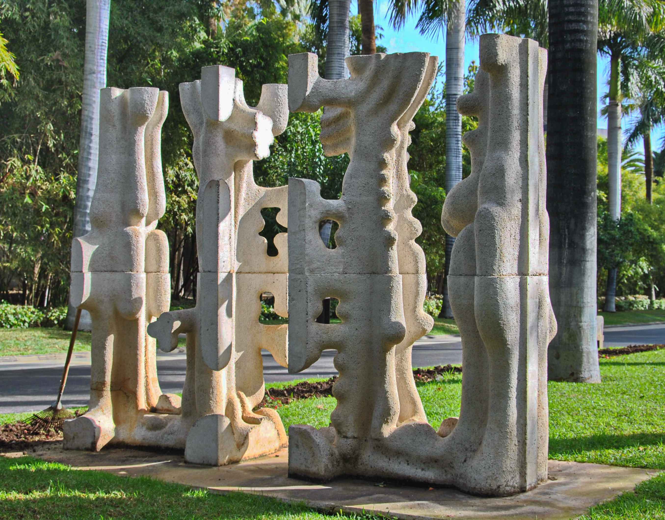 Sin título, escultura de piedra artificial y cemento blanco con marmolina, grupo escultórico que representa dos parejas de cuerpos antropomórficos verticales, en piedra artificial, 1973, autor Federico Assler (Santiago de Chile, 1929).
