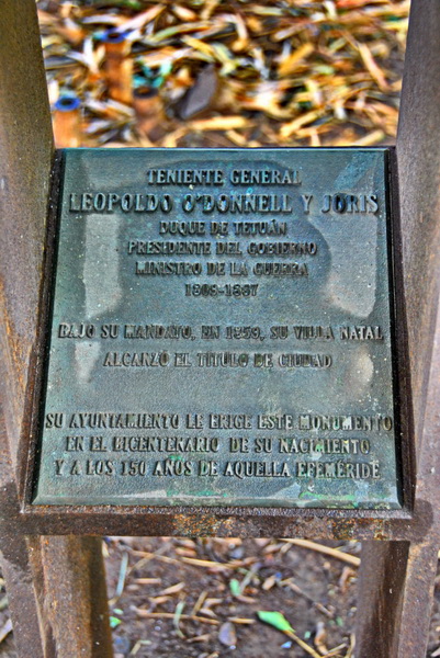 Monumento a Leopoldo O'Donnell y Jovis (1807-1867) escultura en bronce sobre pedestal, tiene una placa con el siguiente texto: Teniente General, Duque de Tetuán, presidente del Gobierno y Ministro de la Guerra. Bajo su mandado, en 1859, su Villa alcanzó el título de Ciudad. Su Ayuntamiento le erige este Monumento en el bicentenario de su nacimiento y a los 150 años de aquella efeméride. Es una copia de la original del autor Agustín Querol Subirats, que se encuentra en el Ayuntamiento de Santa Cruz de Tenerife. Ubicada en la esquina del Paseo de los Bambúes con el Paseo paralelo a la calle Numancia, mirando hacia la calle General O’Donnell.