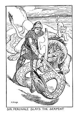 Sir Percivale and his twin-brother, Gurgi, were raised in the woods by their mother who wanted them to know nothing of knighthood; but, having seen some of High-King Arthur’s knights, Percivale determined to go to the Royal Court at Caer-Ligualid (Carlisle) and become one. His mother told him to demand either a kiss or a jewel from any ladies he met. So, when Percivale came upon a girl asleep in a tent, he kissed her and purloined her ring. On arrival at King Arthur's court, he discovered that the Red Knight had insulted Queen Guinevere by throwing wine over her and departing post haste. So Percivale pursued and killed him. He later stayed with an old knight named Gornemant de Goort who taught him chivalry and knighted him. Leaving his tutor, he came to the castle belonging to Lady Blanchefleur which was under siege by King Clamadeus. So he defeated Clamadeus in single combat and became Blanchefleur's lover. On the way to see his mother, a fisherman directed Percivale to his old family castle at Listinoise (which means “Castle in the North”) where he beheld an old man - Pelles, the Fisher King - on a couch and was given a fine sword. The Holy Grail was paraded before him, but Percivale did not ask what the Grail was or whom it served. When he awoke the next morning, he found his sword broken and the castle deserted. He only just escaped it alive. Percivale then encountered his cousin who informed him that he should have asked more questions and told him to take the sword to its original forger. On his journey, he overcame the husband of the girl whom he had kissed earlier in the tent, who had not understood that Percivale had acted innocently. After five years of wanderings, he finally returned to Listinoise and asked his questions. He discovered that the Fisher King was wounded by fragments of a sword which had killed his brother. Though sustained by the Grail, his wounds would not heal until the murderer was brought to justice. Percivale killed the villain and the King recovered. It was then revealed that Percivale was the Fisher King’s nephew and when the he died, Percivale succeeded to his kingdom.