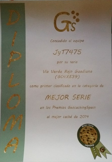 Como resultado de todos los puntos favoritos y los votos después, esta serie se ha llevado el 1º premio obteniendo un diploma acreditativo y una preciosa geocoin que podrás registrarte como "VISTA" si completas toda la serie.