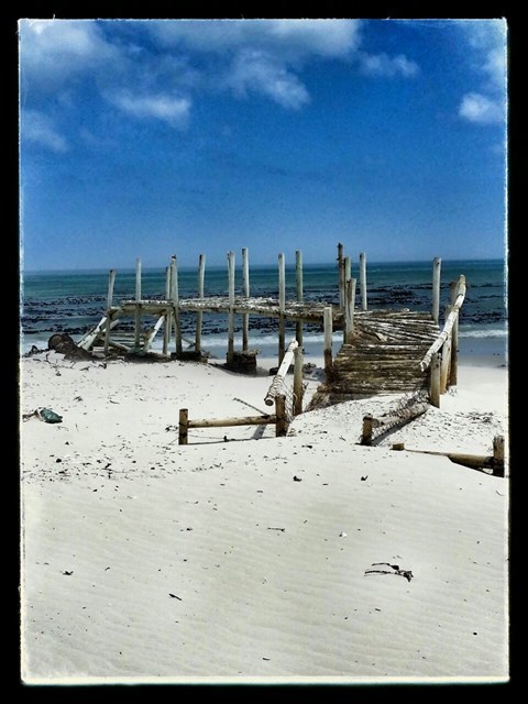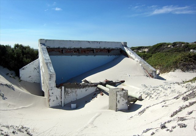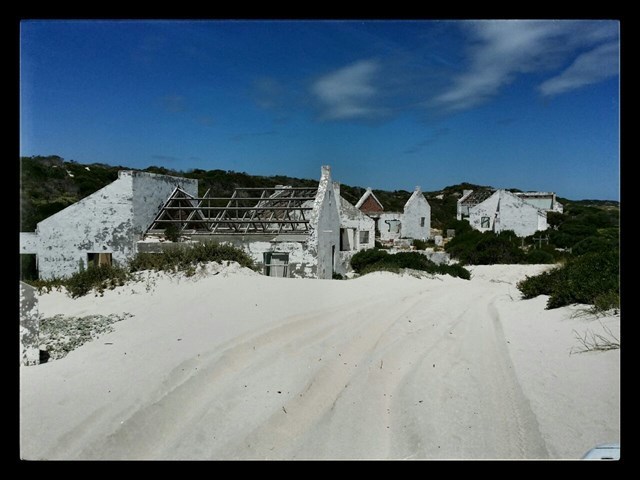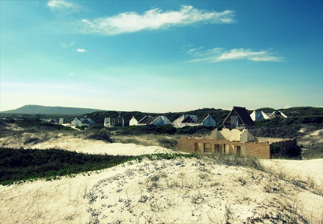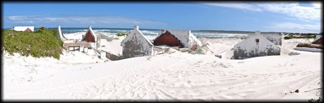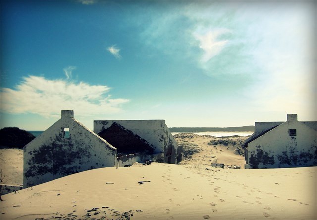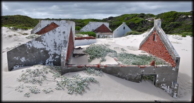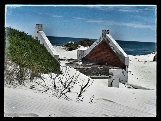 Near Buffeljagsbaai in the Western Cape is a small place that suffers the same fate. Sand dunes creep up from the beach to drown a once popular holiday village. Slowly the cottages are drowning beneath the white sands.