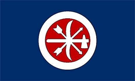 About 200 Choctaw braves enlisted in the Confederate service early in 1863, under the command of Major Pearce, and soon afterward found themselves in a disastrous engagement with Union soldiers at Tangipahoe. They flew this distinct banner which features the native weapons of the Choctaw tribe. Many of the Indians and several of the white officers were captured at the battle and some of the Indians were taken North and put on exhibition. This put an end to the battalion as a formal organization, but some of the Choctaws later became dismounted scouts in Spann's Battalion of Independent Scouts.
