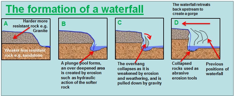 With the water continuing to cut into the softer rock, the pool gets deeper, increasing the relative height of the waterfall, and the soft rock directly beneath the waterfall gets undercut. At this 2nd stage of waterfall development the water will not touch the cliff as the hard rock layer at the top is overhanging the softer eroded layers below.