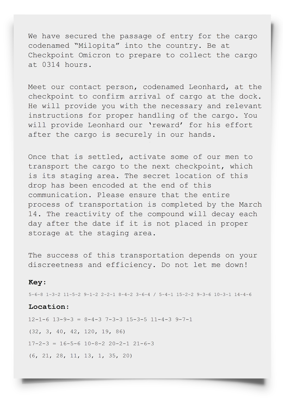 I have attached an intercepted message sent by someone from the smugglers’ inner circle of trust to a henchman on the ground. Unfortunately, the location has been coded, and we will need your help to crack it. Good luck with the investigation!