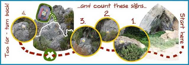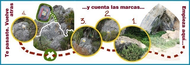 Zähle die gelb-weißen Wegmarkierungen ab dem Loch auf der Altea-Seite. Kurz vor der 4. Markierung wirst du fündig. Der Cache liegt hinter einem hüfthohen Stein in der Nähe des Lochs am Wanderweg.