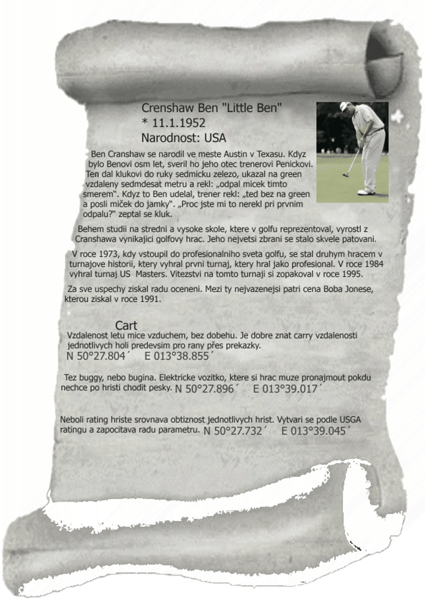 Po prijezdu na parkoviste, zajdete do recepce golfoveho klubu a oznamte, ze zde budete parkovat a mate povoleni od vedeni klubu, dodrzujte pravidla silnicniho provozu. Cestou nevstupujte na hraci plochu golfovych hrist. Sleduj waypointy a praporky, celkem cca 8 az 9 km.