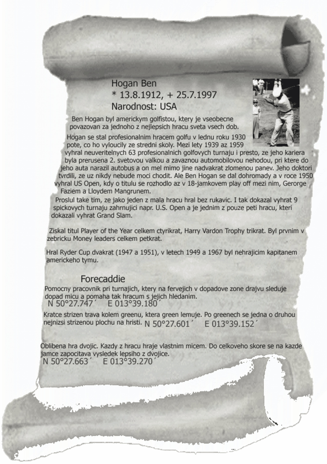 Po prijezdu na parkoviste, zajdete do recepce golfoveho klubu a oznamte, ze zde budete parkovat a mate povoleni od vedeni klubu, dodrzujte pravidla silnicniho provozu. Cestou nevstupujte na hraci plochu golfovych hrist. Sleduj waypointy a praporky, celkem cca 8 az 9 km.