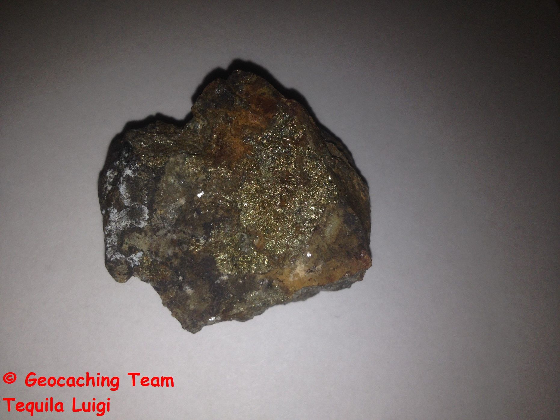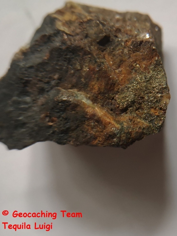 1. Schaut euch das hier herumliegende Pyrit genau an, welche Farbe hat es und welchem anderen Metall ähnelt es? (Zur Orientierung ist auf dem Bild ein Stein mit Pyrit darauf abgebildet)