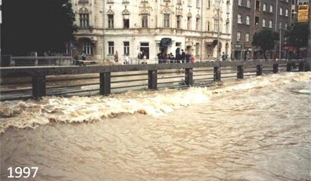 Most na Masarykově třídě při povodních v roce 1997. Most bude přestavěn právě proto, aby při povodních svou špatnou konstrukcí zbytečně nebrzdil vodu.