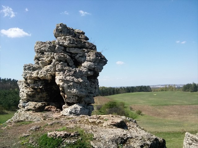 1. Współrzędne prowadzą Cię w miejsce, skąd widać Skałkę Triasową. Widać w niej przechodzące na wylot dziury. Stojąc dokładnie na podanych współrzędnych, policz ile ich jest. Zapisz sobie tę liczbę jako D, będzie Ci potrzebna do zaliczenia EarthCache C(r)aCO(w)3.