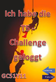 Bei dieser Challenge geht es darum, dass 11 Cache mit der Wertung T5 in der Cacherkarriere geloggt worden sind. Dabei ist es egal, was für ein Cache es ist, jede Art zählt. Es können 11 Traditionals sein, wer es schwieriger mag, darf auch Multis, Mysterys, Letterboxen oder Wherigos mit dabei haben, wer mag, darf auch an Events oder CITOs teilgenommen haben, wichtig ist halt nur, dass diese die Wertung T5 haben.