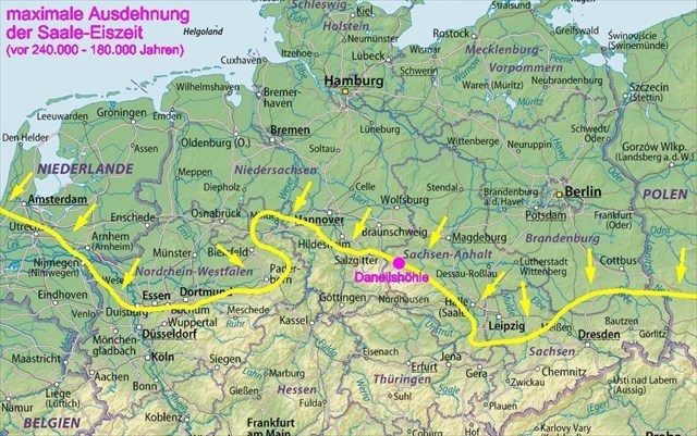 Die maximale Ausdehnung der hierfür verantwortlichen Saale-Eiszeit (vor 240.000 - 180.000 Jahren) ist auf der Grafik ersichtlich.