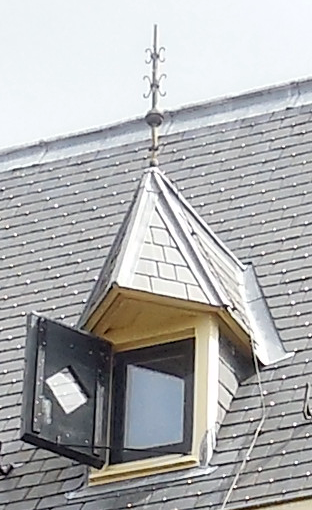 How many dormers on the same streetside as the statue? |