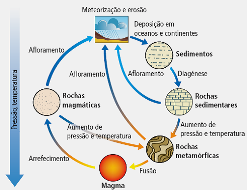 As rochas que se encontram à superfície terrestre têm diferentes origens e estão relacionadas através de um ciclo que se denomina Ciclo das Rochas.