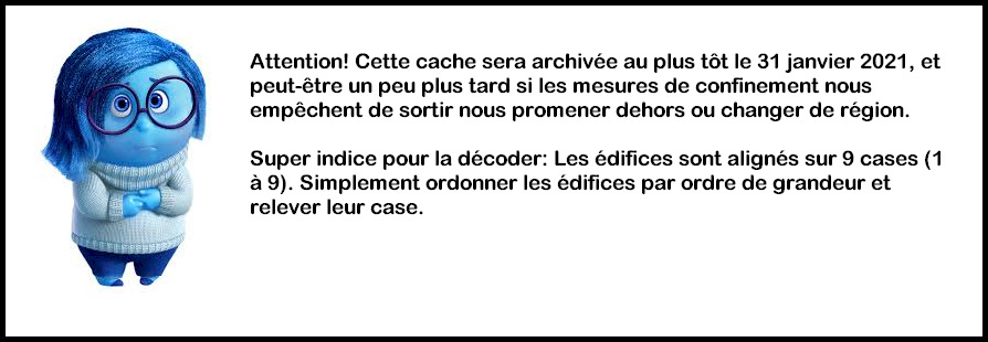 mlafortu: Tel qu'annoncé en janvier, cette cache est maintenant archivée. Elle aura vécu 6 ans et 10 mois et aura reçu 63 founds. Merci de votre visite et de vos logs.