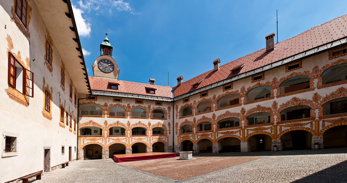 Dominating over the old town, Idrija's castle has preserved its historical name, Gewerkenegg, which in German means mine castle. It was built in the period from 1522-1533 for the needs of the mercury mine. Initially used to store wheat and mercury, the castle was later occupied by the mine administration for more than 400 years. Over the centuries, it has also housed various offices, schools and residents. In the mid 18th century, the Renaissance castle complex with its three round corner towers and single front tower was renovated in baroque style and painted with decorative frescoes. Its present-day appearance dates back to the first half of the 1990's.