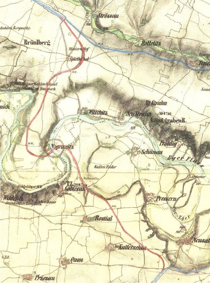 Těleso trati v zářezu nad Březnem se může nadále pochlubit naprosto unikátním jevem: bylo využito celkem třikrát. V sousedství zrušené tratě, na katastru obce Vičice, byl roku 1918 otevřen hnědouhelný důl Karel, k němuž hodlala firma R. Kürschner z Ústí n/L postavit úzkokolejku. Drážka byla dokončena zřejmě roku 1921, měla rozhod 760 mm, délku asi 2 kilometry a parní provoz. Úzkokolejka byla v provozu jen krátce. Těžba dolu Karel se uvádí pouze do roku 1921. V pořadí třetí koleje v této trase existují dodnes a patří Kadaňsko-tušimické důlní dráze, vybudované v 60. letech 20. století k zásobování elektráren Tušimice a Prunéřov. Další část dnes leží pod hladinou nechranické přehradní nádrže.