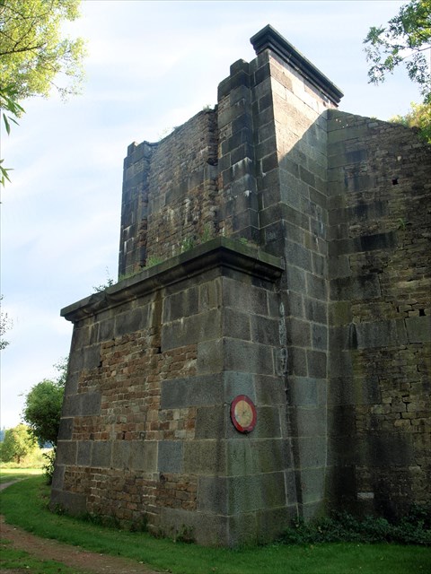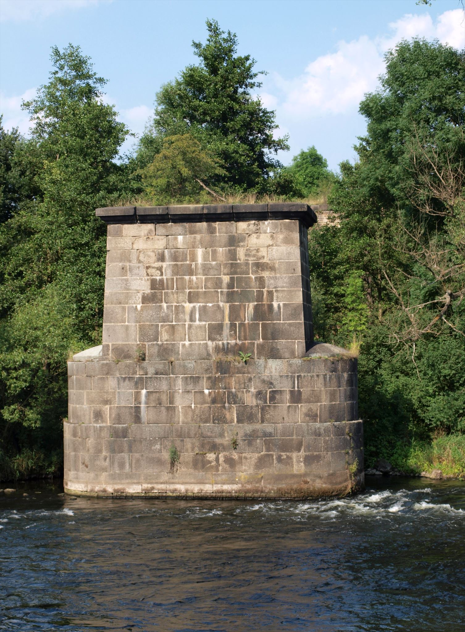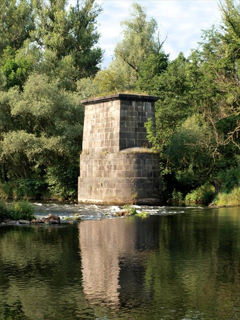 Pilíř bývalého mostu v korytě řeky a opěra náspu na levém břehu.