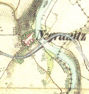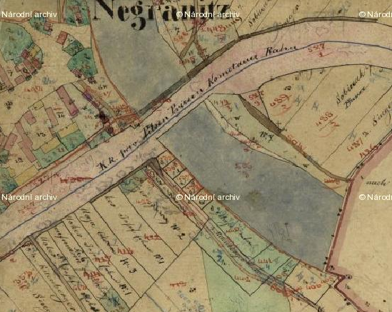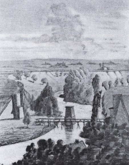 Most na historických mapách z 19. století a kresba dřevěného mostu v místě pilířů.