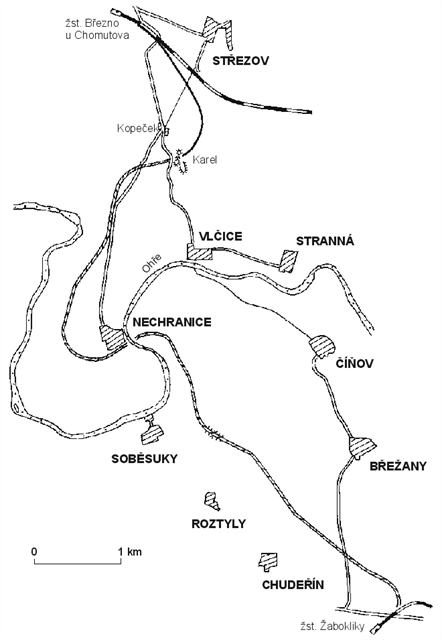 Až do dnešních dnů místy zůstalo v krajině zachováno opuštěné traťové těleso a v řece Ohři kamenné pilíře – pozůstatky příhradového mostu o dvou polích s rozpětím 57 metrů (celková délka pak byla 114 metrů). Před bývalou zastávkou Sobiesak (Soběsuky) a přímo v obci Nechranice se dochovaly dva kamenné mostky.