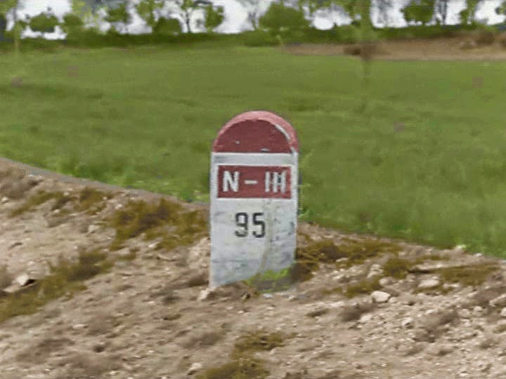 Mojón del kilómetro 95 de la Carretera Nacional III en 1973 a su paso por la localidad conquense de Villarrubio