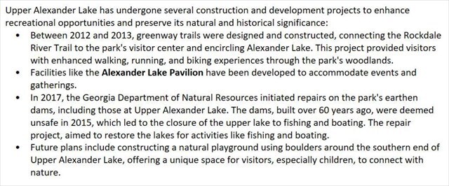 Upper Alexander Lake is one of two lakes within Panola Mountain State Park, located near Stockbridge, Georgia, just 15 miles east of Atlanta. Together, Upper and Lower Alexander Lakes cover approximately 35 acres and are separated by a spillway.