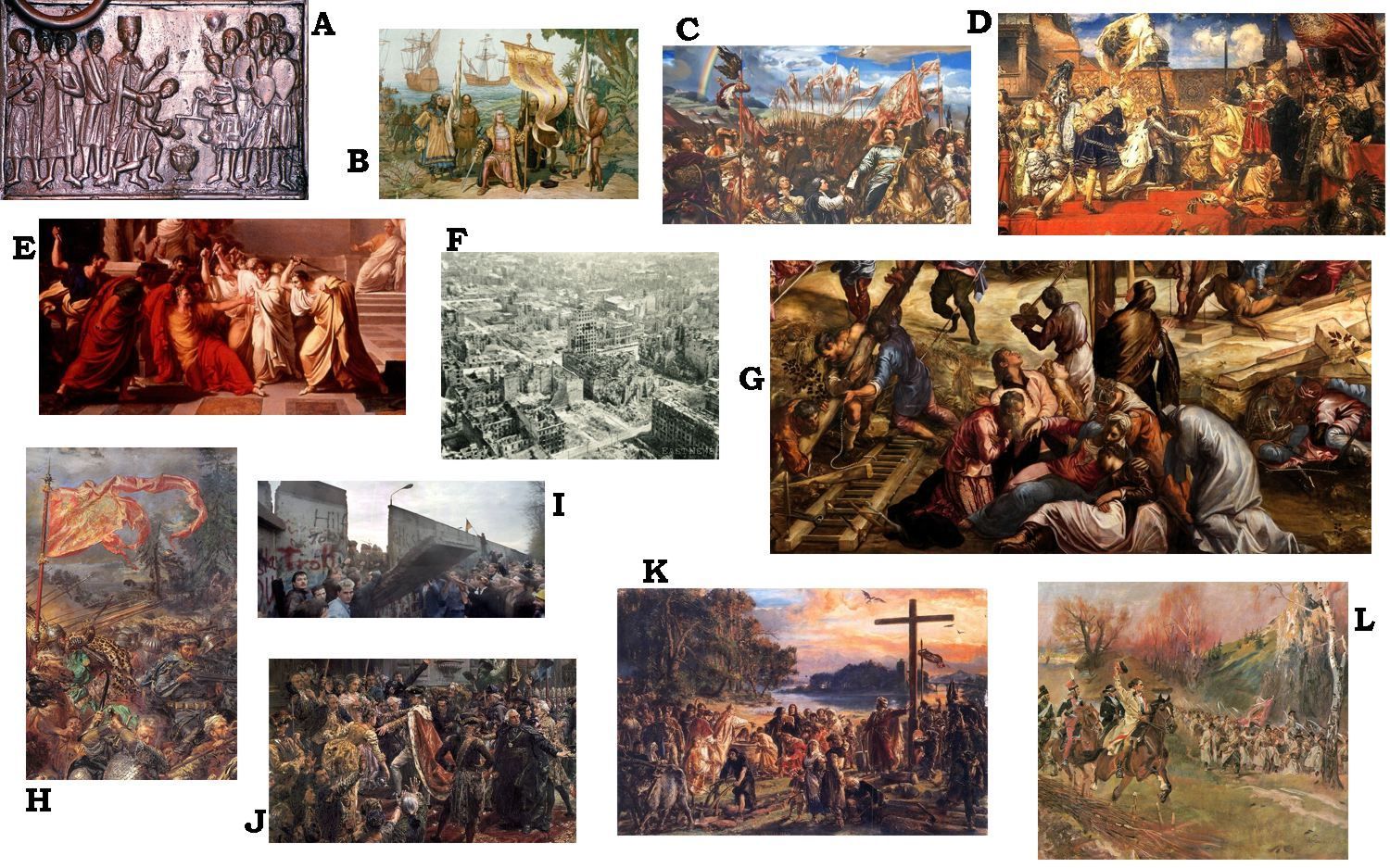 Poniższa grafika przedstawia ważne wydarzenia historyczne. Zidentyfikuj, w którym roku każde z tych wydarzeń miało miejsce. Każdej literce przypisz ostatnią cyfrę roku odpowiadającego jej wydarzenia.