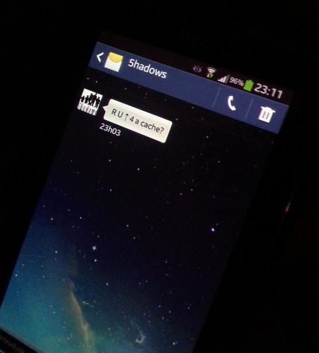 "R U ↑ 4 a cache?" foi (e às vezes ainda é) um termo utilizado por nós para desafiar colegas a ir procurar umas caixinhas. O desafio era feito através duma sms e o texto já estava guardado nas mensagens pré-definidas. O destino era sempre incerto, mas o objectivo era sempre o mesmo, a busca de um tesourinho e algumas horas de convívio e diversão.