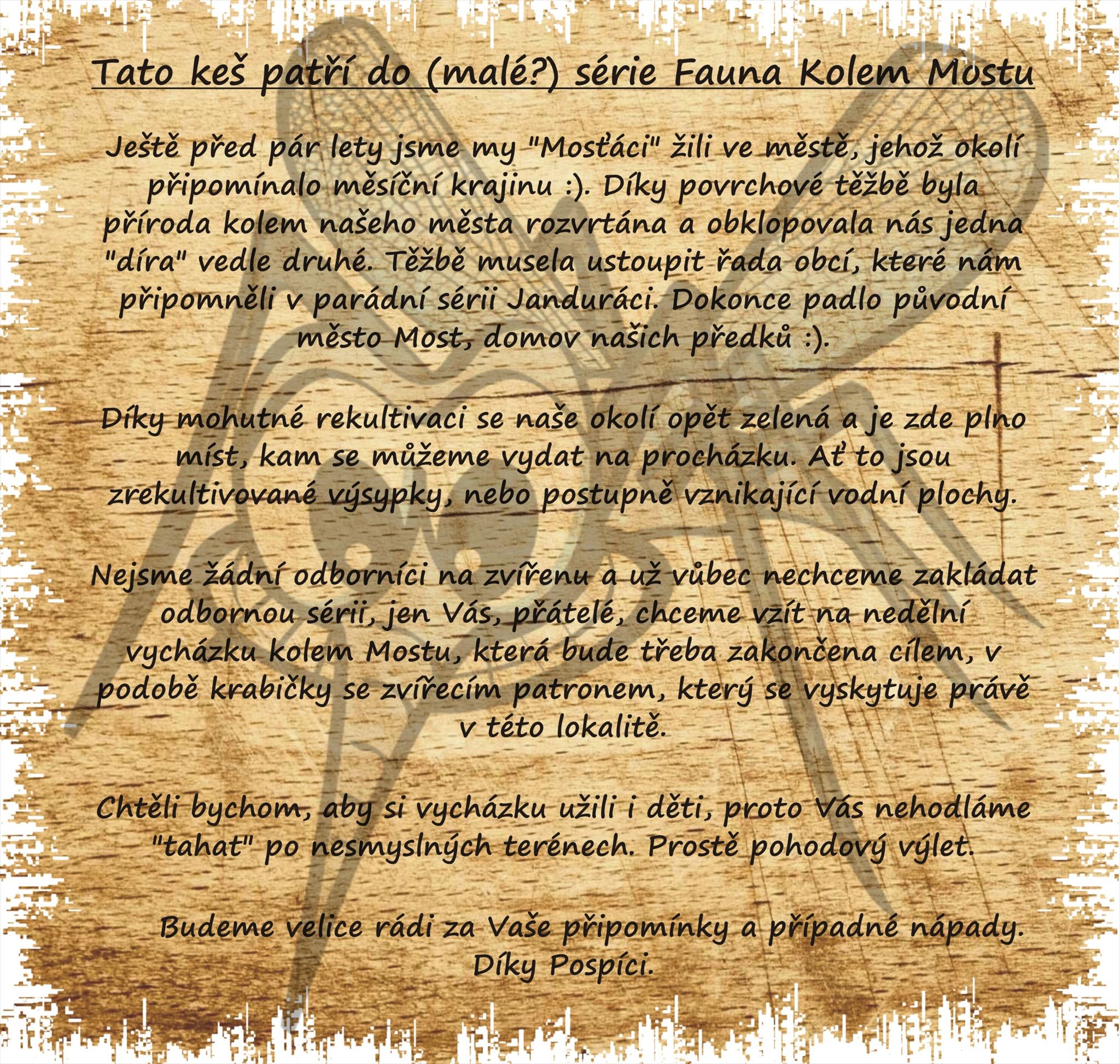 Keš se nachází na Čepirožské výsypce. Výsypka dolu Šmeral u obce Čepirohy bezprostředně navazuje na úbočí Čepirožské výšiny. Rekultivační práce byly zahájeny v roce 1973 uvolněním 59 ha plochy do rekultivace. Projekt řešil kompletně celou plochu s ohledem na okolí lesoparkové rekultivace v okolí města Mostu v rozsahu 34 ha lesní-lesoparkové plochy včetně přístupových komunikací. Výsypka je zpřístupněna systémem parkových cest. Široký sortiment stromů i keřů, včetně okrasných dřevin a zakomponování lesních palouků podtrhuje charakter příměstského lesoparku.