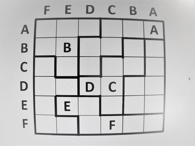 The cache is not hidden at the given coordinates. You will need to solve the grid puzzle. Every row and column of this grid should contain one each of the letters A, B, C, D, E and F. In addition, each of the six shapes (marked by thicker lines) should also contain one each of the letters A, B, C, D, E and F. Complete the grid to find the coordinates.