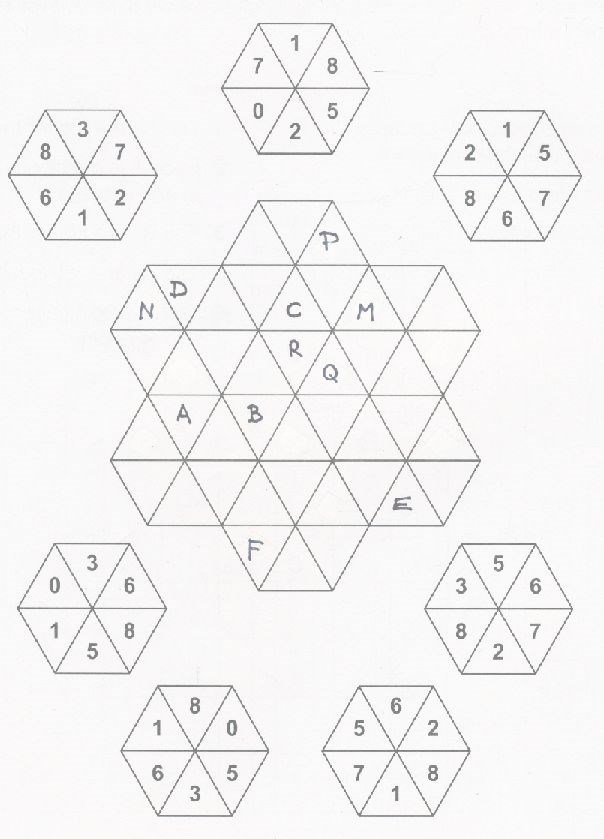 Place the hexagons into the grid, so that where any hexagons touches another along a straight line, the contents of the triangles are the same. No rotation of any hexagon is allowed. Good luck.
