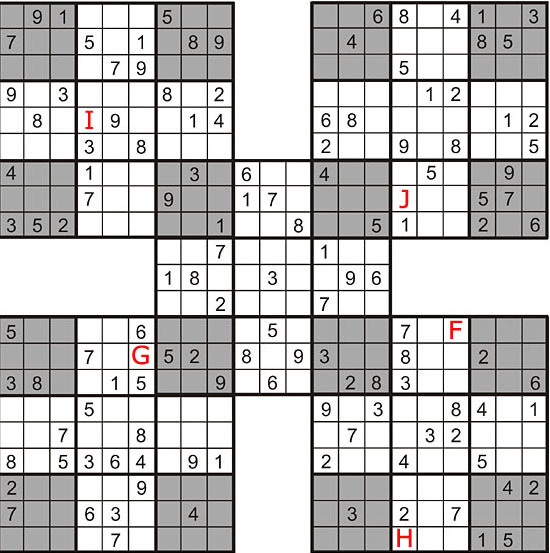 Das Sudoku für die Ostkoordinate ist ein sogenanntes Samurai-Sudoku.
