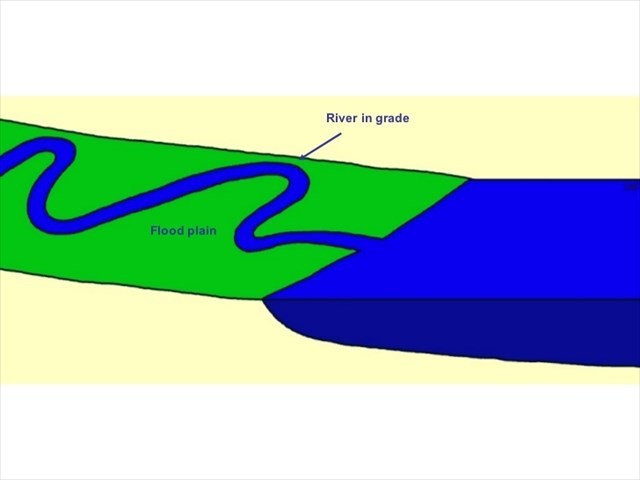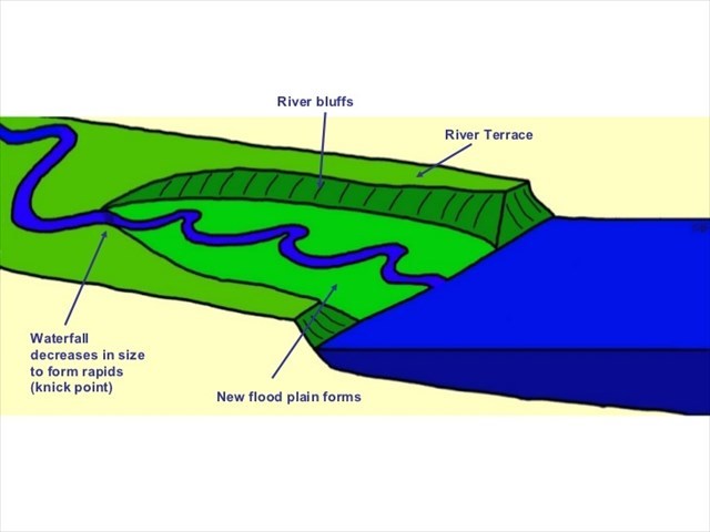 Should the land be uplifted or the sea level lowered, the river will begin to erode downwards in order to re-establish the equilibrium or graded long profile in a process called rejuvenation, which is illustrated below:
