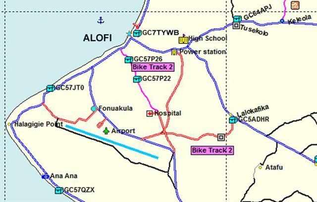 Printed maps and descriptions of the bike tracks are available from the Niue Visitor Information Centre. The descriptions, as here, are all for biking around clockwise. Waypoints are given, or geocaches placed, where you leave the sealed road, at major junctions, and where you return to the sealed road.