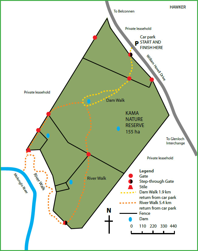 Kama Nature Reserve is located off William Hovell Drive opposite the suburb of Hawker and about 5.5 km from the Glenloch Interchange. Access is from the eastern side of the road. Walk through an underpass to the park.