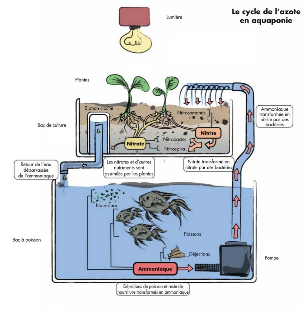 Les poissons sont les fournisseurs d'éléments nutritifs tandis que les plantes servent de biofiltres. Les plantes purifient l'eau qui reviendra au niveau des poissons.
