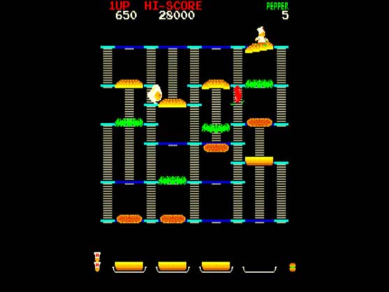 The player is chef Peter Pepper, who must walk over hamburger ingredients located across a maze of platforms while avoiding pursuing characters. The object of the game is to complete a number of hamburgers while avoiding enemy foods. When Peter Pepper walks the length of an ingredient (bun, meat patty, tomato, etc.), it falls one level. If it lands atop another ingredient, the latter in turn falls one level. A burger is completed when all vertically aligned ingredients have been dropped out of the maze and onto a waiting plate. Once all burgers are completed, the game level is finished.