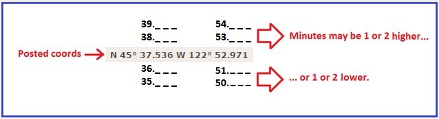 Remember: The posted coordinates for this cache are N 45° 37.536 W 122° 52.971, so the solution should be within 1 or 2 minutes. Look for patterns for words to spell out these numbers: