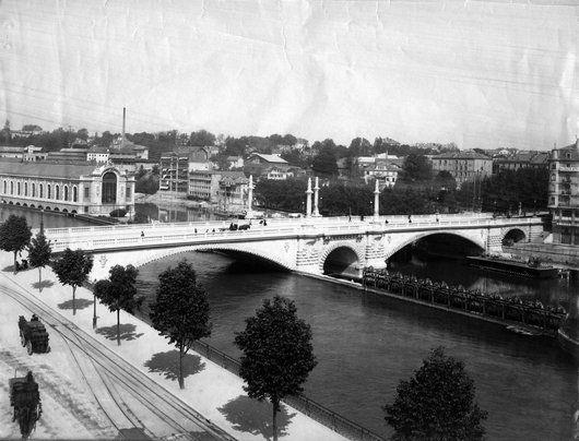 The project of this new bridge dates 1825. The first version of the bridge, in metal, is realized between 1856 and 1857. Too expensively to maintain and especially too light to support the weight of the streetcar, it gives its place, on April 27th, 1896, to a second concrete version and covered with freestone coming from Saint-Imier planned to allow the passage of the steam streetcars which make the connection of the Cornavin station to the site of the national Exhibition. In 1970, the bridge of Coulouvrenière is widened to allow the creation of two pavements of 3,70 meters each. On this occasion, the granite balustrade underlined by a grey marble ledge which lined the bridge as well as the granite 11 meter columns are eliminated. In 1995, the bridge finds the streetcar when the line 13, connecting the station Cornavin and the Bachet-de-Pesay, is put into service. In 2001, a staircase is added to the bridge and allows to join directly "la promenade des Lavandières".