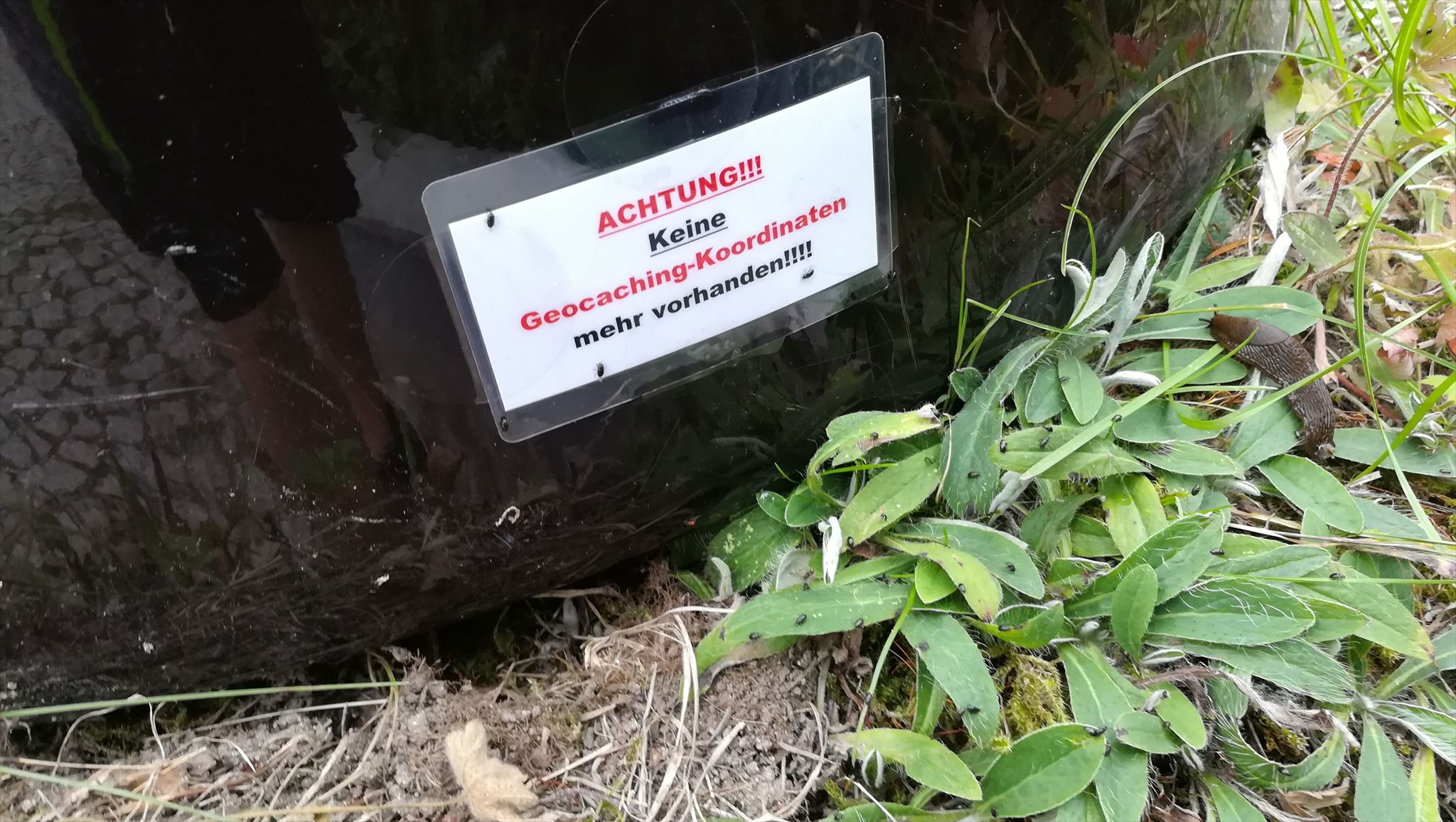 Hier sucht ihr einen einfachen Tradi. Naja zumindest das Versteck ist leicht zu entdecken, das muggelfreie Loggen ist hier die größere Herausforderung. Es ist doch etwas muggellastig. Übrigens darf die Flasche nicht untergraben werden! Die Dose befindet sich auf der Rückseite