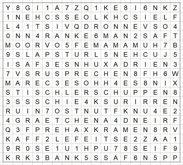 Es sollen 10 Fragen beantwortet werden, die mit dem früheren Leben der Mucklas bei Pettersson und Findus zu tun haben. Die Lösungswörter sind dann in dem Rätselkasten zu suchen (waagerecht, senkrecht, diagonal, auch verkehrt herum). Hinter den Lösungswörtern stehen die Lösungszahlen, die für a bis j hier einzusetzen sind: N 52° ab.cde E 009° fg.hij