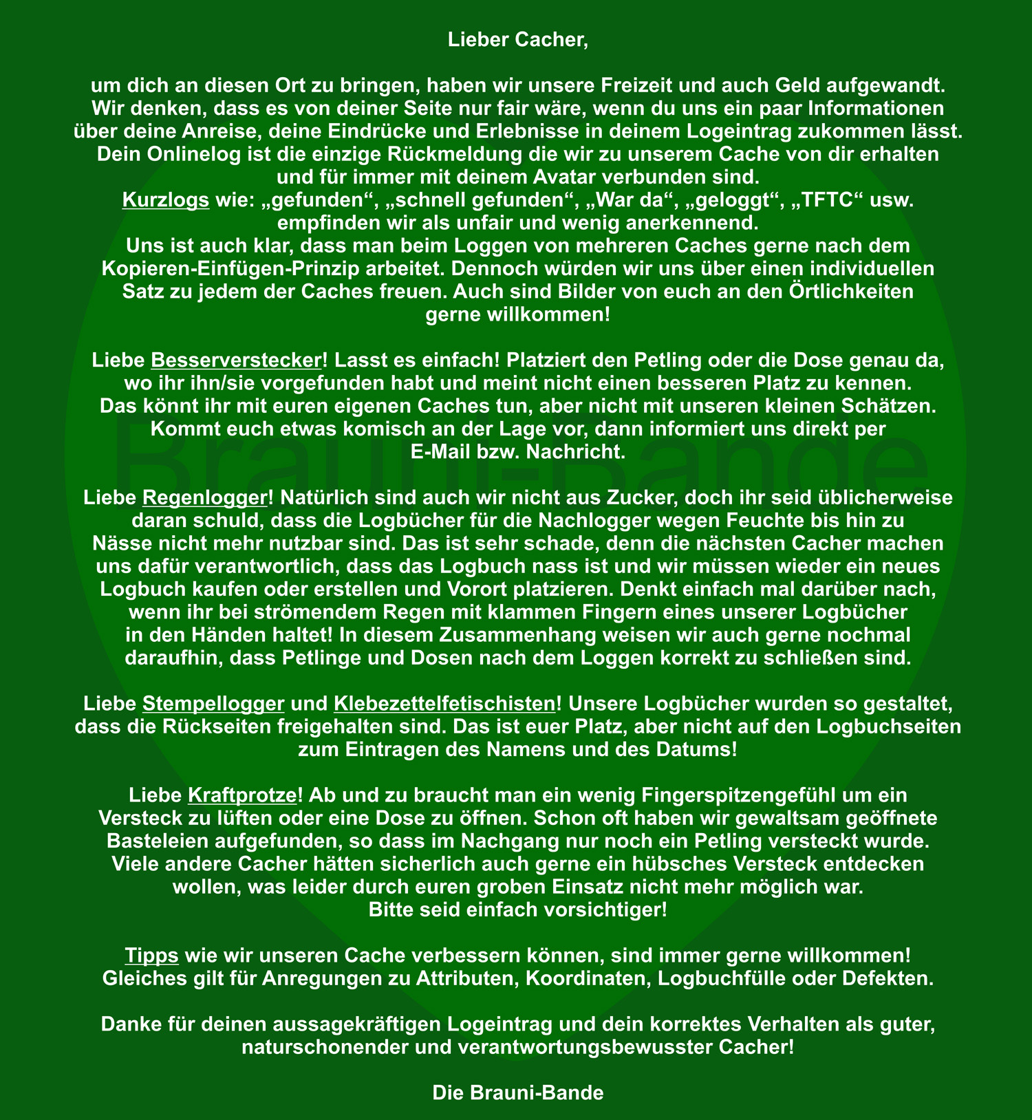 Wenn du an dieser Stelle wieder einen Cache platzieren möchtest, kannst du selbstverständlich gern ein neues Listing zum Review einreichen.