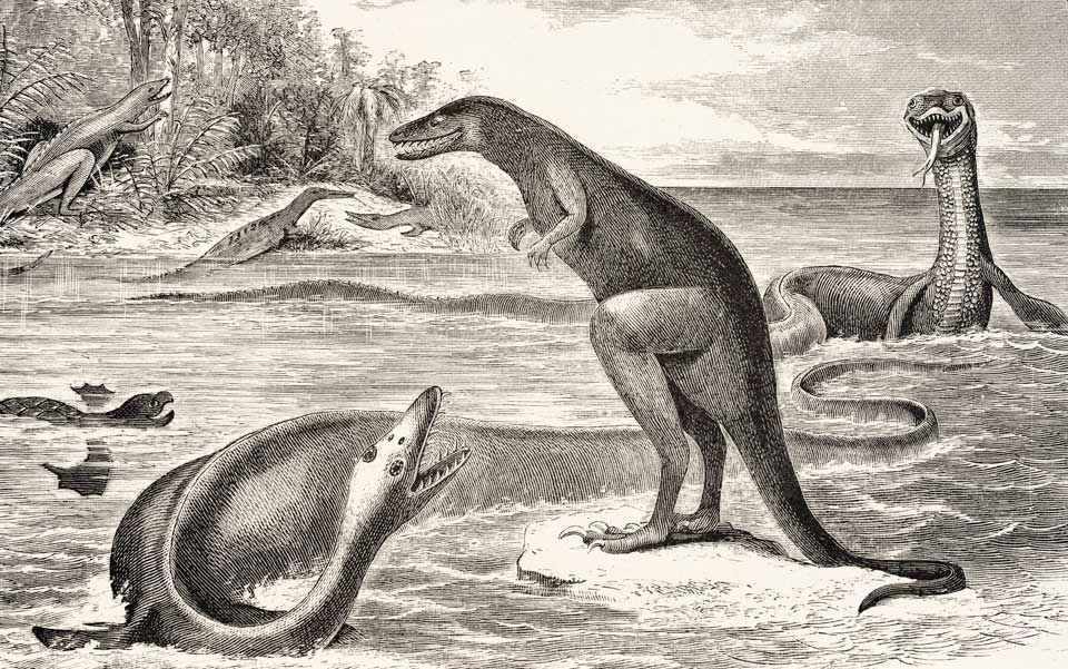 The Geology of Cheesequake State Park: Eighty million years ago the park lands would have been right on the edge of the late Cretaceous period Atlantic Ocean. Some dinosaurs - likely Dryptosaurs, Hadrosaurs and Deinosuchus (distant relatives of crocodiles) might have been among the first park visitors as the land was just being built up. Clay and silt running down the ancient versions of the Delaware, Hudson and Raritan rivers collected along the shore which stretched in a southwesterly line from eastern Middlesex down to western Salem counties (the lime-green band in the image to the left). This sediment would mix with sand and eventually form (from lowest to highest) the muddy Cheesequake, sandy Magothy, gravelly Merchantville and clayey Woodbury sedimentary rock formations on which the park now sits. The formations are fairly similar being made up primarily of sand except the Woodbury Formation which contains a very pure white clay. It was this clay that was used to create the pottery that became area's first industry. The Woodbury Formation is also excellent for fossil hunting and in 1858 even yielded the skeleton of a Hadrosaurus - the first nearly complete dinosaur skeleton ever discovered. In more modern times, with the glaciers melting at the end of the most recent ice age, new rivers formed and sea levels changed dramatically. Eventually the Raritan bay started to intrude on the current low-lying areas and a salt marsh began to form.