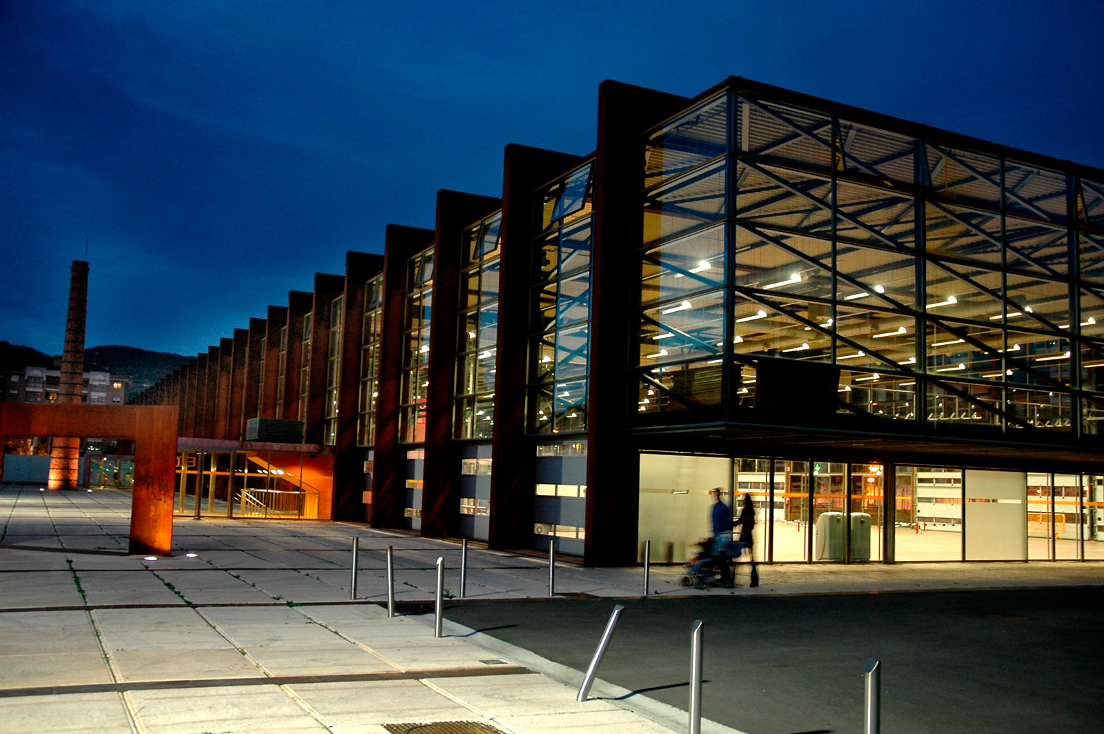 Una gran chimenea se levanta en el centro de la plaza. Se trata del único elemento que perdura de la antigua Fundición Olma (1920).